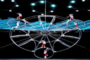 “碧波輕舟”。水幕將整個舞臺變成了一泓湖水,水幕中出現了飄飄忽忽的一個光體,由遠至近,由小變大,那是中國古代文明的象征——司南。只見司南在碧波中演變成一葉輕舟,緩緩飄來。“時空之輪”。旋轉的大風車慢慢地變成了巨大的懸掛在空中的“生命之輪”。它是由 3 個直徑達 2